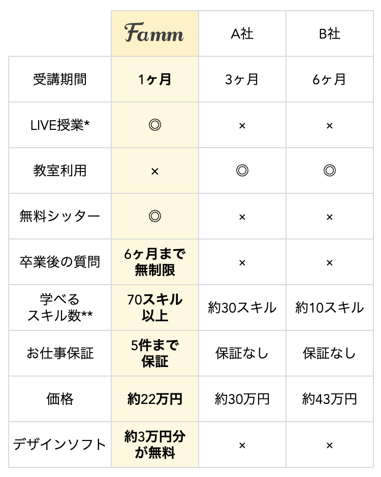 Fammスクールは「ママが在宅で月に10万円以上を稼ぐことに特化」して本当に必要な内容を選び抜くことで低価格を実現しています。